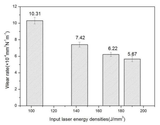 The variations of the coefficient of friction (COF) and wear rates of the SLM as-built samples at different E are shown in Figure 13 and Figure 14, respectively. Obviously, the input E played an important role in the sample’s wear properties. With the increment of E from 103 J/mm3 to 190 J/mm3, the mean COF reduced from 0.40 to 0.29 and the corresponding wear rate from 10.31 × 10−4 mm3/Nm to 5.67 × 10−4 mm3/Nm. In addition, the COF value of the largest 0.40 shows an apparent fluctuation phenomenon with the sliding time increasing under the lowest E of 103 J/mm3. At a higher E of 143 J/mm3, the mean COF value reduced to 0.33, resulting in a lower wear rate of 7.42 × 10−4 mm3/Nm. When the input E reached 190 J/mm3, the COF decreased gradually to a stable value of 0.28 with the lowest wear rate of 5.67 × 10−4 mm3/Nm. From the experimental results, the higher the input E, the smaller the COF value was, that is, the wear resistance of the material was improved.