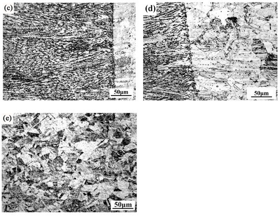 The typical microstructure of the laser overlap weld with no gap is depicted in Figure 1. As shown in Figure 1a, the weld geometry is “cup-shaped” and the penetration state of the joint is full penetration. The cross-sectional microstructure of the lap joint can be proximately divided into three regions: laser welding zone (LWZ), heat affected zone (HAZ), and base metal (BM). Due to the characteristics of the high energy density and low thermal input [14], the width of the HAZ of the laser welding joint is very narrow (about 0.2 mm). Comparing Figure 1b,e, the microstructure of the base material area is polygonal and the grain size is relatively large, but in the laser welding zone there are columnar crystals and dendrites with different orientations and the grain size is fine. The high magnification morphology of the center of the laser welding zone (Figure 1b) indicates that the crystal solidified microstructure is dendrite and the dendrite microstructures are a larger size in the middle of the weld. The grain size decreases as it gets closer to the edge of the weld, and the crystal solidified microstructure becomes a cellular dendritic crystal and columnar crystal (Figure 1c). The crystals growth orientations are approximately perpendicular to the fusion line. Comparing the microstructures of the HAZ with that of BM (Figure 1d,e), the grain size in the HAZ is obviously increased.