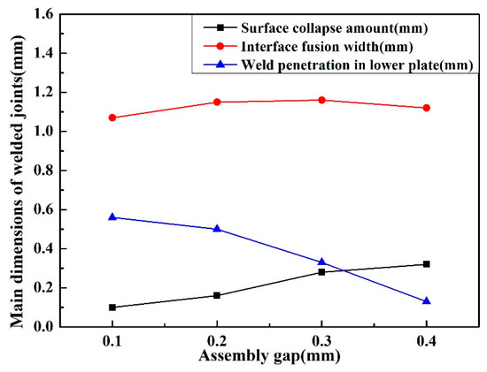 Figure 7 shows the curves of the interface fusion width, weld penetration depth in the lower plate, and the surface collapse amount with the the change of gaps in the same welding parameters. When the gap increased from 0.1 to 0.4 mm, the weld penetration depth in the lower plate decreased from 0.58 mm to 0.13 mm. This was mainly due to the loss of laser energy at the gap with the increase of the gap, and the excavation effect of the metal vapor generated by the laser radiation at the bottom of the hole was weakened, leading to the decline of the weld penetration depth. It is found that the size of gap has little effect on the interface fusion width. It could be deduced that as more liquid metal flows into the gap and melts the side wall, the loss of plasma in the gap results in the decrease of the plasma absorption on the laser, showing that the weld width is no different. With the increase of the gap from 0.1 mm to 0.4 mm, the surface collapse amounts are 0.1 mm, 0.16 mm, 0.28 mm, and 0.32 mm, respectively. The weld metal is not enough to fill the gap because of the excessive gap width, leading to a gradual increase of the collapse amount of the weld surface. According to the PRC National Standard GB/T 22085.1 of the electron and laser-welded joints guidance on quality levels for imperfections [20], the surface collapse amount of a weld should not exceed 10% of the upper plate thickness (0.1 mm), so the assembly gap should be controlled less than 0.1mm in order to ensure the surface quality of welded joint when complying with the PRC National Standard.