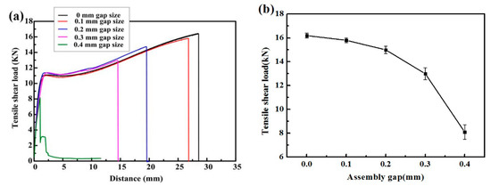 The effect of assembly gap size on the joint tensile and shear forces; (a) tensile-shear force-displacement curve; (b) tensile-shear force-assembly gap curve.