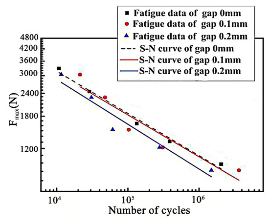 The fatigue strength of stainless steel laser welded joints is an important property that affects the performance of the stainless steel railway vehicle. In the manufacturing process of the side wall structure of the railway vehicle body, the frame and skin are connected by overlapped joints. The overlapped weld zones have obvious stress concentration under the action of cyclic loading. The other main factors causing stress concentration is the assembly gap, which will increase the non-uniformity of welded joint strength and lead to the decrease of the fatigue performance of welded structures. The above study shows that when the assembly gap reached 0.3 mm or more, the laser welding joints did not meet the quality standards because the surface collapse amount of the weld exceeded 0.1 mm and the tensile-shear force of the weld was less than 11 kN. Therefore, only the fatigue properties of joints with gap sizes less than 0.2 need to be studied. The fatigue performance of joints was tested at room temperature with a cyclic stress ratio r = 0.1 and pull-pull loading. The tensile and shear fatigue load without cracking during 107 cycles is defined as the conditional fatigue load. Figure 11 shows the fatigue curve drawn by the maximum tension shear load (Fmax) and cycle number (Nf). As shown in Figure 11, the assembly gap has a certain impact on fatigue performance. When the assembly gap sizes increased from 0 mm to 0.2 mm, the fatigue limit of the weld joints decreased from 822 N to 760 N. Based on the least squares method, specimen with a 0 mm gap illustrate a higher fatigue performance compared with specimens with a 0.2 mm gap but illustrate a similar fatigue performance compared with specimens with a 0.1 mm gap. Therefore, the assembly gap should be controlled less than 0.1 mm in order to ensure the fatigue performance of the joint.