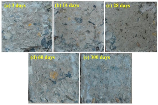 The bonding surface for specimens in group B after splitting tensile tests: (a) at 3 days, (b) at 14 days, (c) at 28 days, (d) at 60 days, (e) at 300 days.