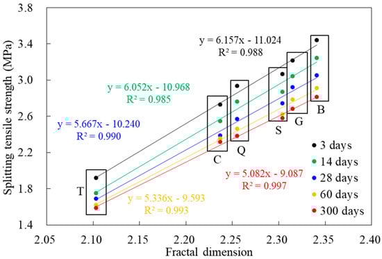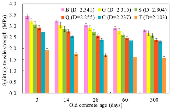 The splitting tensile strength results are shown in Figure 4. For the specimens in group B, G, S, Q, and C, the splitting tensile strength decreased as the increase of old concrete age. For the specimens in group T, the splitting tensile strength did not decrease significantly with the age, and the strength was the lowest in each phase. It was mainly due to lower roughness with small value of fractal dimension (2.103), which was more close to the smooth surface. At the same age of old concrete, the splitting tensile strength increased with the increasing surface roughness (higher fractal dimension). When the age of old concrete reached a certain age (60 days), the splitting tensile strength did not change significantly. When the age of the old concrete was shorter, the failure surface was accompanied with more cement slurry fractures, and the corresponding splitting tensile strength was larger (Figure 3 and Figure 4).