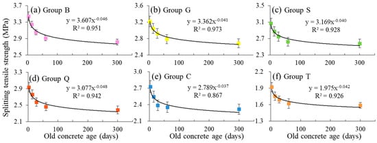 The relationship between splitting tensile strength and old concrete age for new-to-old concrete structure: (a) Group B, (b) Group G, (c) Group S, (d) Group Q, (e) Group C, (f) Group T.