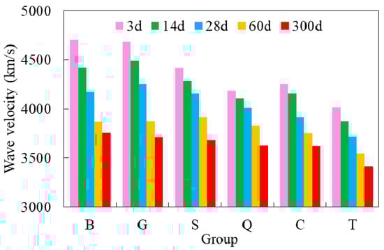 Figure 8 shows the ultrasonic non-destructive test results. The wave velocities of group G and B were the highest at each curing age. Under the same surface roughness condition, the wave velocity decreased obviously with the increase of the age of the old concrete. Under the same age of the old concrete (less 28 days), the wave velocity was closely related to the age of the roughness. When the old concrete age was longer than 28 days, the surface roughness had little effect on wave velocity. The results corresponded to the mechanical properties well, which could be understood that the ultrasonic non-destructive test results could reflect the interior defects of concrete such as pores and micro cracks. The effect of surface roughness and age of old concrete on the bond surface was well proved by ultrasonic non-destructive test.