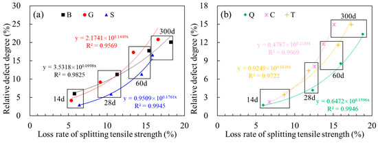 In Figure 9, the relative defect degree (DR) increased with old concrete curing days, which represented the degradation of the internal density of the concrete correspondingly. The loss rate of splitting tensile strength was also increased with longer age of old concrete. It could be seen that the relative defect degree (DR) met the exponential relationship with the loss rate of splitting tensile strength, and the correlation coefficient R2 arranged from 0.9569 to 0.9969 (Figure 9). The results showed that the relative defect degree characterization method proposed in this paper could be used to evaluate the mechanical properties of concrete. In combination with the results of ultrasonic non-destructive test, the loss rate of splitting tensile strength could be evaluated, and the long-term strength of new-to-old concrete could be also predicted further based on the early strength.