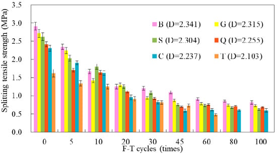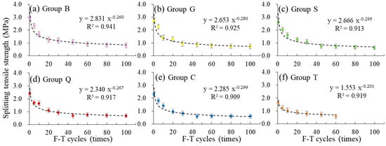 The relationship between splitting tensile strength and the times of F-T cycles: (a) Group B, (b) Group G, (c) Group S, (d) Group Q, (e) Group C, (f) Group T.