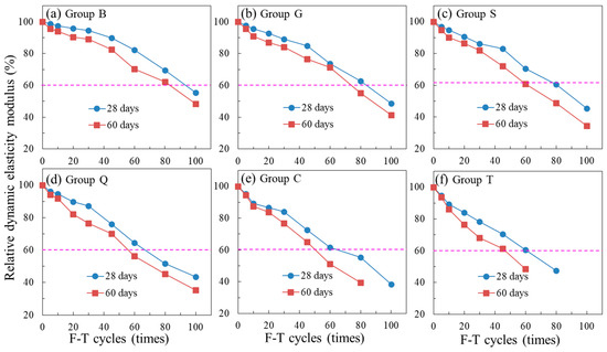 The relative dynamic elasticity modulus of new-to-old concrete under F-T cycles: (a) Group B, (b) Group G, (c) Group S, (d) Group Q, (e) Group C, (f) Group T.