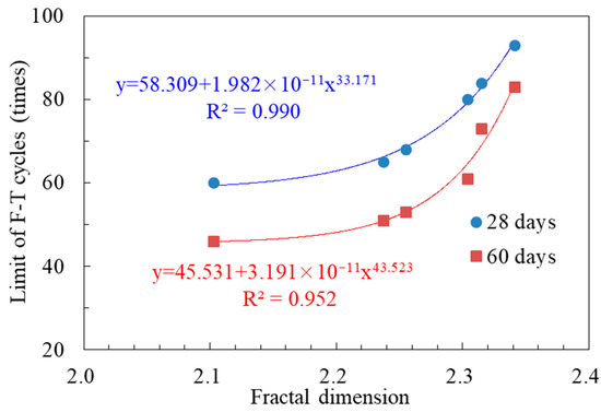 The relationship between surface fractal dimension and limit of F-T cycles is shown in Figure 13, where the limit of F-T cycles refers to the maximum times of F-T cycles that the specimens can withstand (F-T resistance). It could be seen that the development of F-T cycles limit met the power function relationship with the increase of fractal dimension, and the correlation coefficient R2 was greater than 0.95. This relationship was also satisfied with specimens of different old concrete curing ages. Moreover, when the fractal dimension increased from 2.1 to 2.2, the F-T resistance of the new-to-old concrete did not increase obviously, and when the fractal dimension was above 2.3, the increase of interface roughness could improve the F-T resistance significantly.