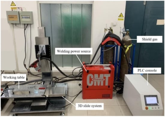 The initial process parameters are provided in Table 2. The wire feed speed was automatically matched with the welding current. The CMT-WAAM system used in the test is shown in Figure 1, and was adapted from the conventional CMT welding system. The CMT-WAAM system included a TPS2700 CMT (Fronius, Pettenbach, Austria) arc welding power supply, a self-developed 3D slide table, and a programmable logic controller (PLC) console for the slide table.