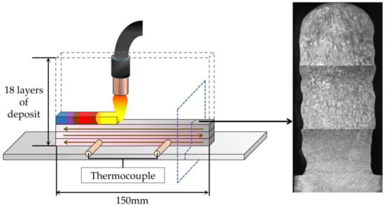 As shown in Figure 2, the wall with 150 mm length and 18 layers was stacked in the form of reciprocating stacking. The specimen was cut along the cross section by wire cut electrical discharge machining (WEDM). A series of thermal analyses were carried out with a Netzsch LFA 457 laser thermal conductivity instrument (Netzsch, Selb, Germany). Two K-type NiCr-NiSi thermocouples were used as a temperature sensor to measure temperature changes during the deposition process. The specimen microstructure was observed with a metallographic microscope (Zeiss, Oberkochen, Germany), and electron back-scatter diffraction (EBSD) analysis was carried out with a FEI-QUANTA 650 scanning electron microscope (FEI, Hillsborough, FL, USA). The microhardness of different areas of the specimen was measured with a Vickers hardness tester (Matsuzawa, Akita, Japan).