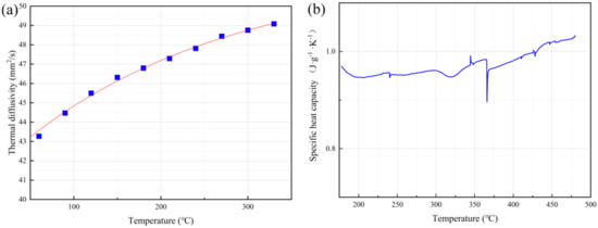 During the WAAM process, the heat transmission and distribution of the material are fairly regular. The specific heat capacity (C), thermal diffusion coefficient (α), thermal conductivity (λ), and density (ρ) of the material determine the heat transfer rate inside the specimen, as well as the temperature values of different regions in the specimen under thermal diffusion. The thermal diffusion coefficient of a material is a measure of the rate at which the change of temperature at one point in the object is transferred to another point. Figure 3a shows the thermal diffusion coefficient of a Al-Mg alloy deposited specimen. The thermal diffusion coefficient of the material increased with the increase of temperature, but the fluctuation of the thermal diffusion coefficient was not large. The range of the value was only 42.69 to 49.08 mm2/s. Because the thermal diffusivity of the specimen was less affected by the temperature change, the change of thermal diffusivity had no obvious effect on internal heat conduction.