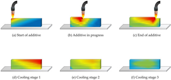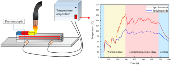where q is the heat flux per unit area, and ∂T/∂x is the temperature gradient in the x direction. When applied to WAAM, q becomes the heat source for the heat input point generated by the arc during welding, i.e. the heat generated during welding by the corresponding welding current and voltage. Therefore, when the heat input q and the thermal conductivity λ of the specimen are relatively constant, the temperature at a given point on the deposited specimen and the length of the distance from the heat source are inversely proportional. For single pass multilayer deposition specimens, the temperature at the bottom of the specimen is lower relative to the top when there is continuous deposition at the top. When the top is exothermic and the bottom is endothermic, the entire specimen tends to have a constant temperature and cool uniformly (Figure 4).