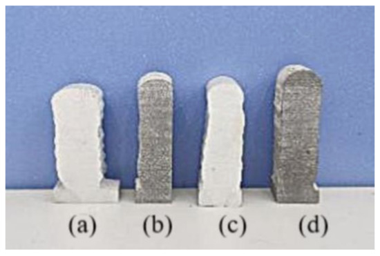 Macromorphology of deposited specimens with different processes. (a) Deposition specimen with constant heat input and inter-layer cooling (Specimen A). (b) Deposition specimen with inter-layer cooling (Specimen B). (c) Deposition specimen with welding current for each layer reduced by 2 A (Specimen C). (d) Specimen with proposed deposition process (Specimen D).