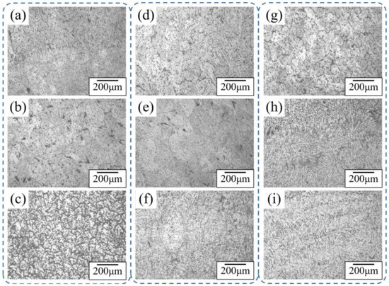 Microstructure of specimens from different processes. (a) Structure of top section of Specimen A. (b) Structure of middle section of Specimen A. (c) Structure of bottom section of Specimen A. (d) Structure of top section of Specimen B. (e) Structure of middle section of Specimen B. (f) Structure of bottom section of Specimen B. (g) Structure of top section of Specimen D. (h) Structure of middle section of Specimen D. (i) Structure of bottom section of Specimen D.