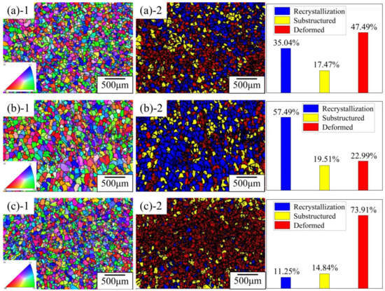 In order to study the effect of different deposition processes on grain formation, the Al-Mg alloy deposits were analyzed by EBSD, and the bottom region of the specimens with a built-up heat effect were observed (as shown in Figure 9). The grains were classified into recrystallized, substructured, and deformed, as divided by the grain boundary angle. It can be seen that Specimen B had the most recrystallized grains (see Figure 9b-2), and the specimen with the reduced heat input process had the least (see Figure 9c-2).