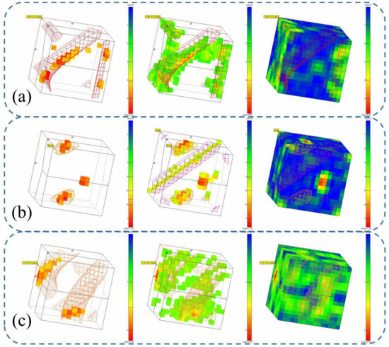 Optimal decision function (ODF) orientation map of specimens. (a) No change of heat input and no cooling (Specimen A). (b) No change of heat input, cooling between layers (Specimen B). (c) Change of heat input without inter-layer cooling (Specimen D). The grid is the region with strong texture strength for different kinds of textures; the regions with higher texture strength of alloy deposits treated by different processes are accurately distributed in the standard grid.