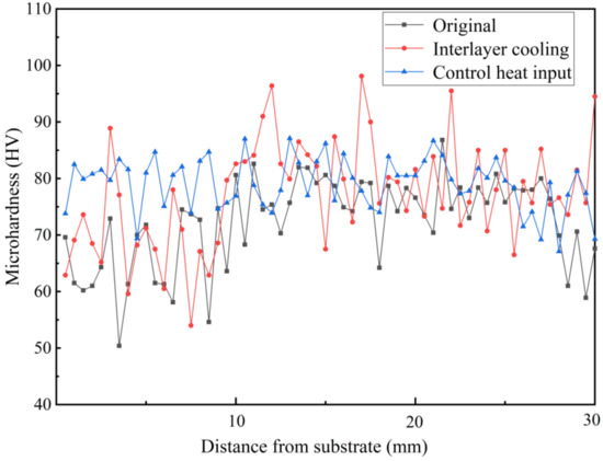 - The specimens with regional control of heat input have the highest average microhardness, and the fluctuation of microhardness is the smallest. The bottom of the deposited specimen is affected by the longest thermal history, resulting in low microhardness.