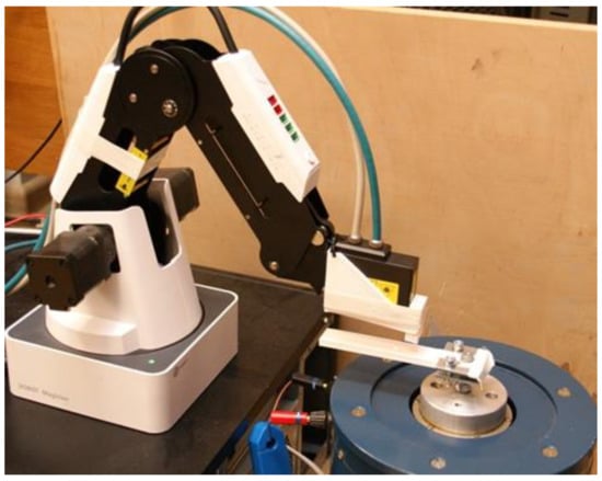 The test stand (Figure 1 and Figure 2) is composed of a vibration exciter and a measuring system; the whole stand is computer-controlled. The measuring system’s fundamental element is a triangulation displacement sensor. Its operating principle is the emission of a laser beam illuminating the investigated point of the specimen; the beam is then subjected to diffusive reflection. The reflected signal returns to the sensor at an angle, depending on the reflection point distance from the sensor, which is recorded by a light-sensitive matrix (one-dimensional image sensor) placed in the instrument and fitted with an appropriate optical system (lenses). The optical sensor returns a digital string of data representing the signal sampled with the frequency of 48 kHz and resolution reaching a few micrometers in the operating range of 10 mm. The test stand also includes a robotic arm to which the above-mentioned sensor is fixed. The arm enables the full control of motion in three spatial directions.