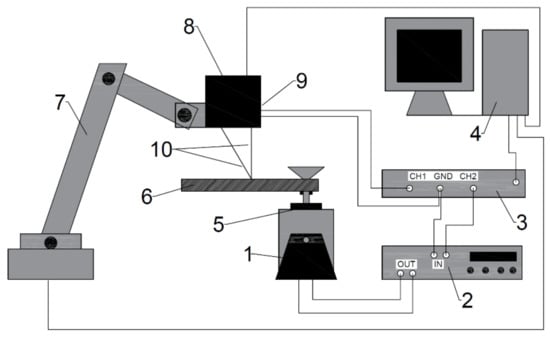 Diagram of the test stand: 1—vibration exciter; 2—amplifier; 3—digital-to-analog converter; 4—computer; 5—mounting; 6—specimen under investigation; 7—robotic arm; 8—optical sensor (distance measurement); 9—synchronizing signal connection; and 10—laser beam.