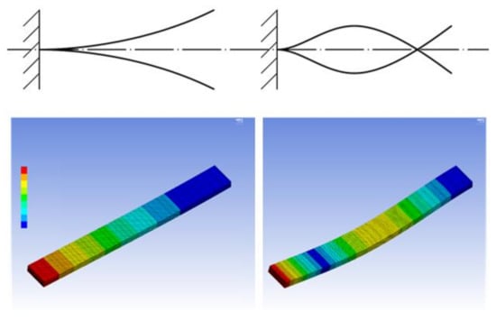 where and for the first and second bending form under analysis, respectively. The analysed forms of the prismatic cantilever beam natural vibration are presented in Figure 4.