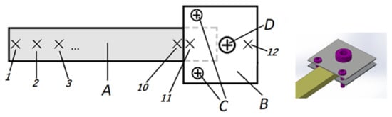 Diagram of the measurement: A—tested specimen; B—fixing metal element; C—fixing screws; D—exciter fixing screw; and 1–12—points of measurement.