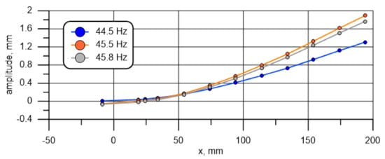 Table 3 presents the results of the displacement amplitude measurement for all 12 points under analysis. The coordinates of the points defined in relation to the fixing screw (D) are given in the second row of the table. It can be seen that the first resonance frequency is included in the investigated range. However, a deeper analysis of the results indicates that precise determination of the resonant frequency is debatable. For the investigated vibration form (mode 1), the highest vibration amplitude occurs at the specimen’s far-end (which is the most distant from the support (Point 1)). The simplest pattern of finding the resonance frequency value (by finding the maximum amplitude in this place) gives the result of 45.5 Hz.