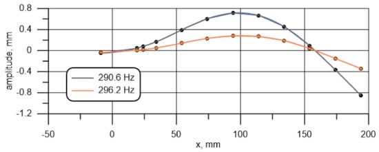 The difference between the node location for the two frequencies (Figure 7) is less than 0.5 mm and, considering the measurement accuracy, is of no practical significance. A higher vibration amplitude for the lower frequency does not necessarily mean a different location of the excited wave nodal point. It may just be due to the way in which energy is supplied to the oscillating system or characteristics of the exciter and the amplifier system. The value of 290.6 Hz was adopted for further consideration.