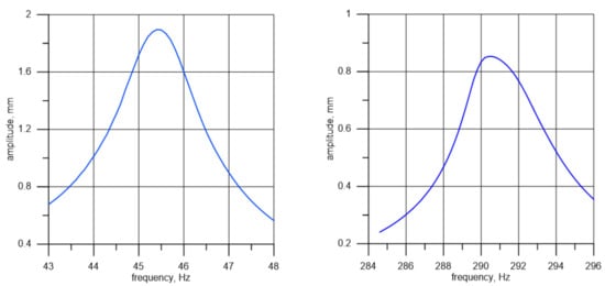 Figure 8 presents the curves illustrating changes in the beam end amplitude, depending on the frequency in the resonance area of the first two bending modes. It can be observed that the curve representing the second mode is more asymmetric in relation to the extremum. This problem may be due to an unknown relation between the exciting force and frequency. It is unknown because, firstly, the characteristic of the sound card amplification, the amplifier, and the exciter is not perfectly linear, and secondly, because the specimen mass and motion affect the motion of the exciter. This characteristic has been corrected to a certain extent, but only for an exciter without a specimen attached to it. If the specimen is attached, especially if there is motion near resonance, additional inertia forces are introduced into the system. In turn, this has a significant impact on the motion of the exciter core and the forces generated within it. Modeling this phenomenon would require knowledge on the exciter’s internal structure (core geometry, number of cores, magnetic and electromagnetic field distribution, etc.) and the amplifier’s response to induced currents. The same phenomenon has, among others, an impact on the shape of the curves in Figure 8 and the amplitudes in Figure 6 and Figure 7.