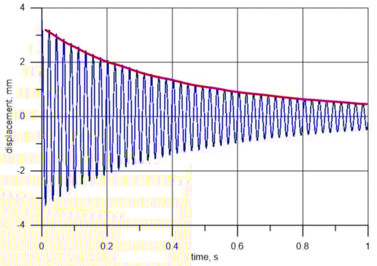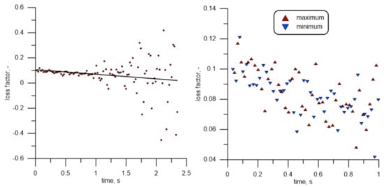 Figure 9 also shows the displacement amplitude history of Point 1 (red curve). It can be seen that at a free-end displacement of the order of 3.5 mm, after about 1 s, the amplitude falls below 1 mm. This explains the rising relative error mentioned above. The presented methods deliver loss at every one period, contrary to matching the curve. This also enables an analysis of the change in the loss factor during each period, together with the change in the amplitude (and time). It has to be mentioned that the samples are collected at a much higher frequency compared to the vibrations. Even in an extreme situation, where the real extremum is exactly in the middle of the collected samples, the deviation of the determined maximum is not bigger than the sensor resolution.