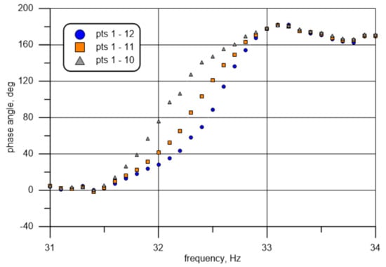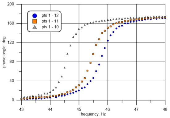 Frequency-dependent phase angle between measuring Point 1 and Point 10—gray, Point 11—orange, and Point 12—blue.