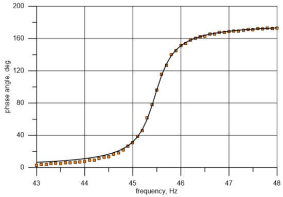 Based on Equation (9), it is possible to draw a theoretical curve and compare it to the measuring curve (frequency-dependent changes in the phase angle) for known values of the damping ratio and natural frequency. It follows from Equation (9) that a change in natural frequency involves a change in the location of the point where the curve runs through the value of 90 degrees, and a change in damping affects the curve slope or flattening. A rough analysis of the data marked in orange squares in Figure 11 (the phase shift between points 1 and 11) indicates that the natural frequency is close to 45.4 Hz, i.e., (phase angle of 90°). The values were established with a better accuracy using the Microsoft Excel Solver tool. For a frequency of about 45.4 Hz from the range of 44.7–46.1 Hz with the resolution of 0.1 Hz, the approximating function defining the history of frequency-dependent changes in the phase angle was determined. This was achieved by minimizing the functional of the sum of squares of differences in the measured () and theoretically established () phase angle values for each of the fifteen frequencies (points) under analysis (frequency closest to the 90° in the middle):