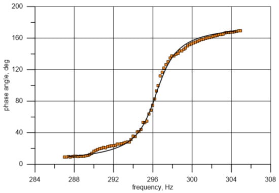 A similar procedure for the phase angle analysis was adopted for the next natural vibration form corresponding to the frequency of about 296 Hz. The theoretical curve was matched based on data from the range of 292–300 Hz. The obtained values of the loss factor and natural frequency were and , respectively. The matching of the curves, together with the points representing the results of measurements, are presented graphically in Figure 12 and Figure 13. For the used test bench, the uncertainty of the measured phase angle values (for one point) is approximately 0.5° for about 45 Hz and changes proportionally with the frequency. The uncertainty of the measured amplitude (for one point) is approximately 0.001 mm and the uncertainty of the measuring frequency is insignificant.