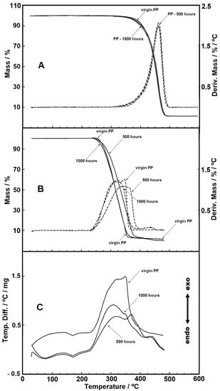 Figure 1A,B show the overlapped curves from TG/DTG analyses for the PP samples in synthetic air and nitrogen purge gases, respectively. In nitrogen (Figure 1A), the thermal behaviors occur in only one stage of thermal decomposition, with similar behaviors between samples. For the test in synthetic air (Figure 1B), a minor difference during the thermal decomposition took place. In this case, the samples aged for 500 h and 1000 h showed thermal decomposition beginning at 228 °C, which is less than the value for the virgin sample (235 °C). Furthermore, the DTG curves from synthetic air also show that the decomposition reaction does not occur in a single step for the virgin sample, being possible to identify an event during the last step of the main thermal decomposition.