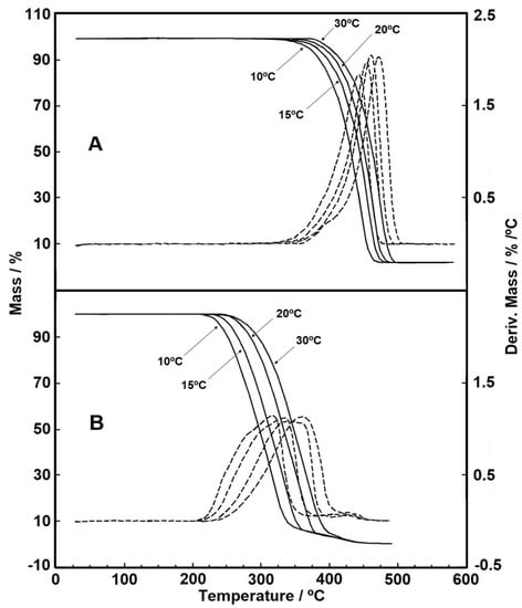 It is common knowledge that the comparison between DTG curves in inert gas and with increased oxygen pressure helps the interpretation of reaction kinetics since the main mechanism of oxidative degradation in polypropylene geotextiles is free radical, initiated by thermal cleavage of the polymer bonds []. Therefore, in Figure 2B the curves related to the 500 h sample were obtained in synthetic air (oxidizing atmosphere) for a better comparison with the results of the virgin sample in Figure 2A (nitrogen purge gas). It is possible to see that the increase in the heating rate caused a displacement between the curves, sustained throughout the thermal decomposition. The thermal displacement with rising in temperature is expected, but Valentin et al. [] reported negligible displacements under different heating rates when studying the thermal behavior of HDPE (high-density polyethylene) geomembrane.