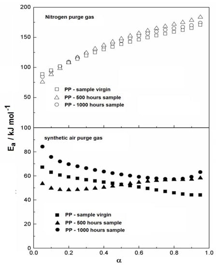Observing the kinetic behavior of the samples evaluated in nitrogen (Figure 3), no distinct difference could be detected from the beginning up to the end of the thermal decomposition, which indicates a homogeneous reaction. However, for the analysis in synthetic air, it is possible to see that the initial values of activation energy differ from each other. The 1000 h sample showed the largest initial activation energy, whereas the lowest value occurred for the material exposed for 500 h. The virgin sample showed an intermediary value for the initial activation energy. Since the analysis in synthetic air promotes oxidation reactions itself, it is not possible to conclude that the effect of exposure to ultraviolet radiation had a significant effect on the activation energy values.