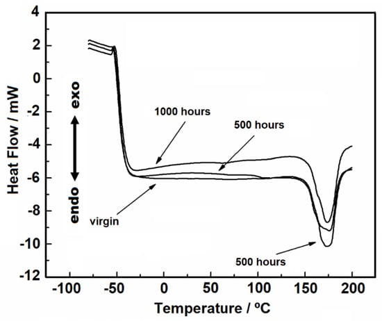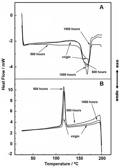 Figure 4 shows the DSC heating and cooling curves in the temperature range of 25 to 200 °C under nitrogen gas purge. During the heating, it is possible to observe an endothermic peak, due to the melting of the material. For the virgin sample, 500 and 1000 h samples, the melting peak has a wide peak area, which indicates overlapped reactions.