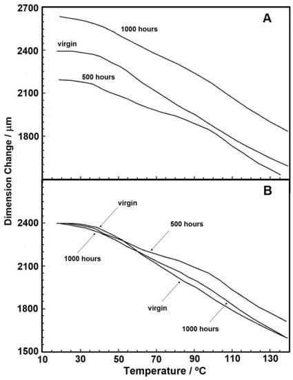 Figure 6A,B show the results for the TMA analyses (without applied force), in which the change in sample dimension is presented in micrometers (µm). A reduction in sample dimension can be observed for all samples, which we attributed to the interlacing of the material fibers that get loose under heating and tend to get closer to each other. It is worth mentioning that each sample has a different nominal thickness since the manufacturing process for nonwoven geotextiles cannot keep a precise thickness for the product. For this reason, as seen in Figure 6A, the larger thickness for the 1000 hours sample is not related to the UV radiation effect, but rather to product variability.
