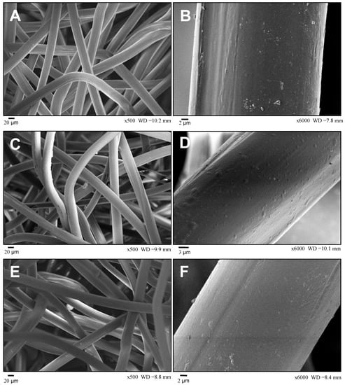 Scanning electron microscopy photographs of the PP fibers: (A,B) virgin PP; (C,D) PP 500 h; (E,F) PP 1000 h. (A,C,E) with 500× magnification and (B,D,F) with 6000× magnification.