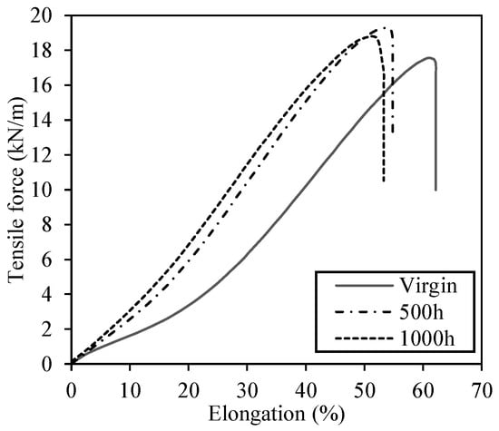 Mean “tensile force–elongation” curves obtained for the PP geotextile before and after accelerated weathering for 500 h and 1000 h (machine direction).