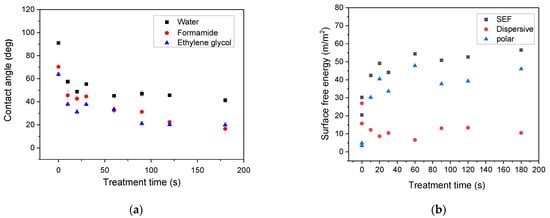 Dependence of (a) contact angle and (b) surface free energy (SFE) of selected liquids on plasma treated low-density polyethylene (LDPE) foil on treatment time.