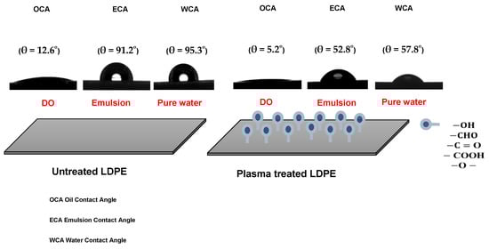 The untreated and plasma-treated PE films were also analyzed in terms of their surface wettability by water, DO, and 100 ppm emulsion. The untreated LDPE surface showed hydrophobic and oleophilic characteristics; the water contact angle (WCA), oil contact angle (OCA) and emulsion contact angle (ECA) showed values of 95.3, 91.2, and 12.6°, respectively (Figure 2). The plasma treatment resulted in a significant improvement in wettability, while the WCA and ECA decreased to 57.8° and 52.8°, respectively. Moreover, OCA achieved 5.2° indicating very high oleophilicity. PE foil immersed into the DO emulsion shows no visible attachment of the oil droplets and DO droplets were freely moving (Figure 3A). On the other hand, PE film immersed in DO formed a continuously covered oil layer with an average thickness of 1.4 ± 0.1 μm, as determined by profilometry. These preliminary findings anticipate the applicability of plasma for improving oil/water separation.