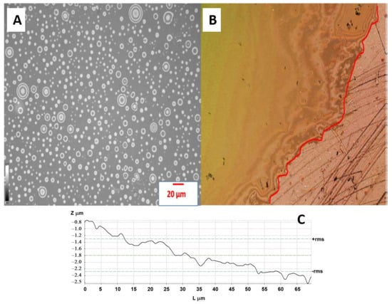 (A) The distribution of droplets of emulsion on the surface of treated PE foil; (B) Thin layer of DO deposited onto the surface of treated PE foil. The red line denotes the interface between the area covered by DO and the reference (non-immersed part of the foil); (C) Line profile for the surface of the treated PE foil.