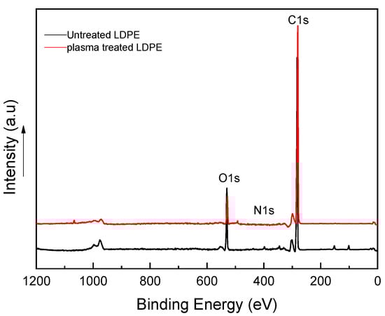 X-ray photoelectron spectroscopy (XPS) spectra for treated and untreated LDPE samples.