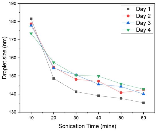 Emulsions are thermodynamically unstable systems due to their natural tendency to minimize interfacial interactions between chemically heterogeneous components [20,21]. From a practical point of view (for instance, because of a delay between emulsion preparation, storage, and testing), it is important to know whether or not emulsions are stable over time. The evolution of droplet size over time is the key parameter for the stability of emulsion estimation since the instability is affected by changes in droplet size [22]. The stability of oil/water emulsions was inspected by Dynamic light scattering (DLS), directly determining the size of the droplets. The results are summarized in Figure 6. The droplet size remains fairly consistent over four days and is directly proportional to sonication time. A higher sonication time results in a smaller droplet size. To prepare a stable emulsion, twenty minutes of sonication was sufficient.