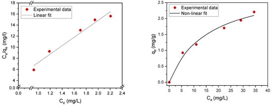 Adsorption isotherms contribute to the effective construction of adsorption systems, because they assess the maximum adsorption capacity that can be attained throughout the treatment process. The experimental results were evaluated using two of the most common isotherms, namely, the Langmuir [26,27,28,29] and Freundlich adsorption isotherms [30,31,32] (Table 3). The maximum adsorption capacity qm (mg/g) and adsorption (equilibrium) constants were determined. The fitting data are summarized in Table 4 and Figure 7 and Figure 8. The results revealed that the experimental data can be well fitted by both the Langmuir and Freundlich isotherms with high correlation coefficients (R2), which indicates mixed monolayer and multilayer adsorption.