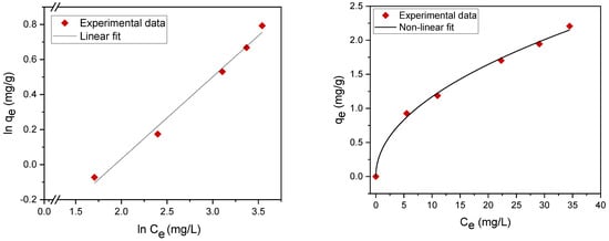 Freundlich adsorption isotherm nonlinear fit (right) and linear fit (left).