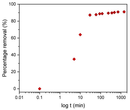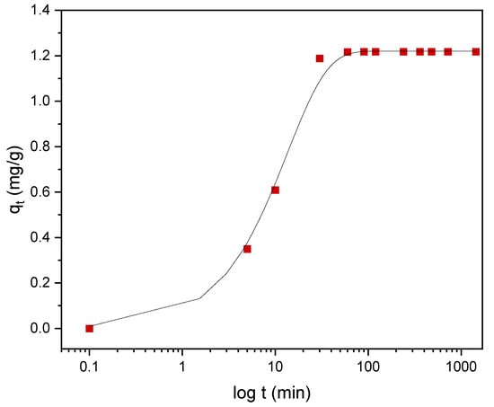Kinetic models serve to estimate the duration of adsorption processes, and, thus, to estimate the time needed for the effective treatment of liquids. In batch systems, the solute concentration in the treated liquid gradually decreases with time until it reaches equilibrium with the adsorbed species. To determine the equilibrium time related to the maximum oil removal from emulsified oils [24], the amount of oil adsorbed onto the adsorbent was studied as a function of contact time in the range from 30 min to 1440 min using an initial oil concentration of 100 ppm and a treated adsorbent dose of 3.0 g. Equilibrium is achieved when the adsorption rate from the solution onto the surface of the sorbent corresponds to the rate of desorption from the sorbent to the solution [4]. As shown in Figure 9, the adsorption capacity (qt) increased over the whole duration of the sorption process; however, most of the oil was adsorbed within a short time (the first 15 min) of the treatment. Thereafter, the oil removal efficiency reaches equilibrium when the rate of adsorption and desorption are equilibrated. This does not necessarily mean that the whole surface area is occupied and that the surface of the adsorbent does not need to be saturated with the oil. A high removal efficiency of 91.0% was achieved. The amount of adsorbed oil is directly proportional to the other parameters: the residual concentration of oil in the emulsion (Figure 10) and the percentage of removal (Figure 11). The first parameter decreases over contact time, whereas the latter increases.