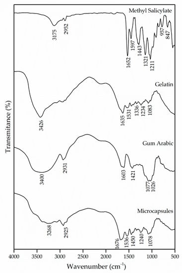 The interactions of the polymers used for the formation of the microcapsules were evaluated by the FTIR technique. Figure 1 shows the spectrograms of the microcapsules that were obtained, as well as those of the wall materials, gelatin and gum Arabic and of the active ingredient methyl salicylate.