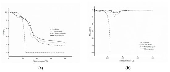 (a) thermal stability (TG) and (b) thermogravimetric curve (dTG) of gelatin, gum Arabic, methyl salicylate and microcapsules.